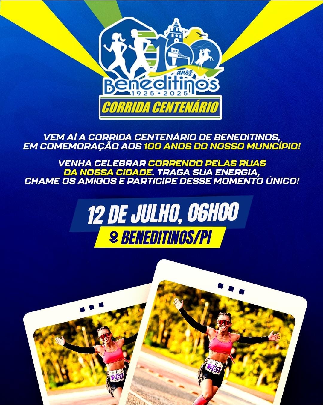 Beneditinos (PI), julho de 2025 – Em comemoração ao centenário de emancipação política do município de Beneditinos, será realizada no próximo sábado, 12 de julho, a Corrida Centenária, um evento esportivo que promete movimentar a cidade logo nas primeiras horas da manhã. Com largada prevista para às 6h, a corrida reunirá atletas amadores e profissionais de diversas cidades da região, que percorrerão ruas históricas de Beneditinos, unindo esporte, cultura e celebração em um só momento.