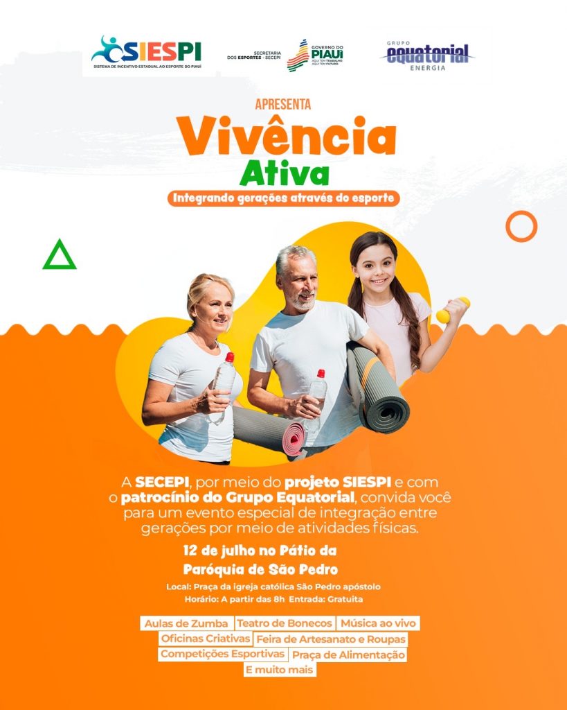 A zona Sul de Teresina será palco de um grande encontro de saúde, cultura e lazer no próximo dia 12 de julho. O projeto Vivência Ativa, uma iniciativa patrocinada pela Secretaria dos Esportes do Estado do Piauí, pela Equatorial Piauí e viabilizada por meio do Sistema de Incentivo Estadual ao Esporte do Piauí (SIESPI), leva ao bairro São Pedro um dia inteiro de atividades para todas as idades, a partir das 8h no pátio da Igreja de São Pedro Apóstolo.